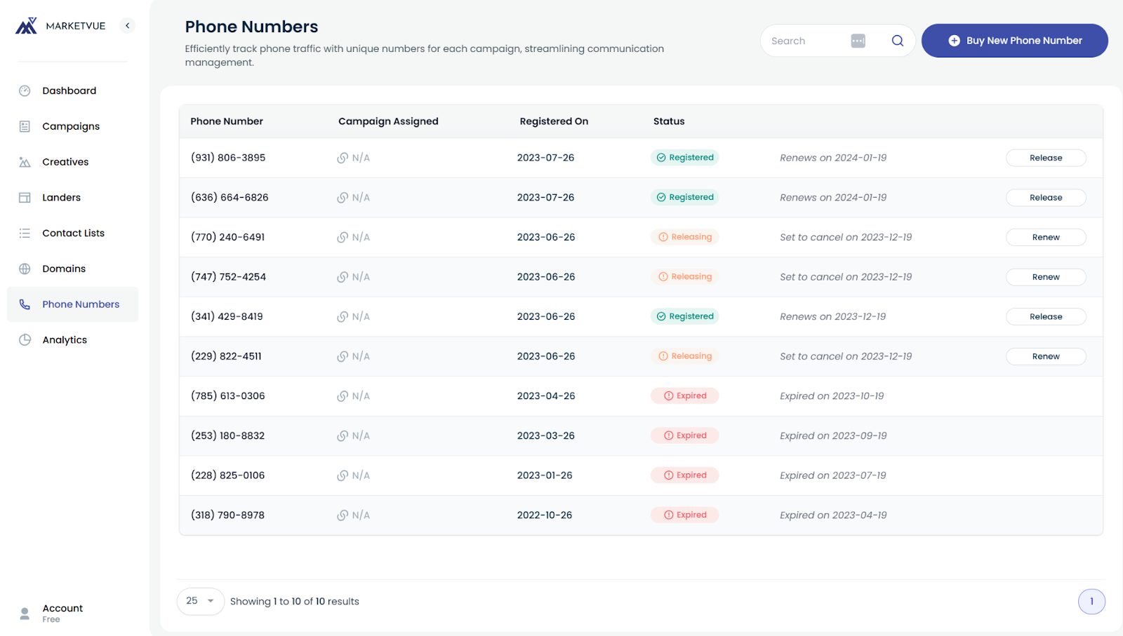 The "Phone Numbers" section of the platform allows you to purchase and manage unique phone numbers for individual campaigns. With features like call tracking, these phone numbers not only serve as a point of contact but also as a valuable analytics tool. Purchases are made on a semi-annual basis, giving you the flexibility to adapt your strategies.
